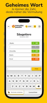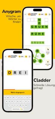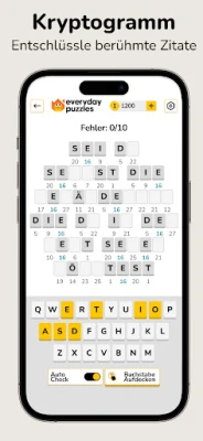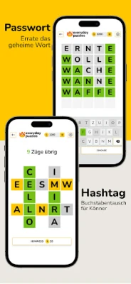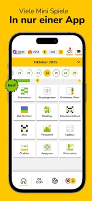 Everyday Puzzles bietet eine beeindruckende Vielfalt an Kategorien, die keine Wünsche offenlässt. Entdecken Sie CONSENSUS, ein soziales Quiz, bei dem Sie die häufigsten Antworten der Community erraten. Fordern Sie Ihre Intuition bei GEHEIMES WORT heraus, um verborgene Begriffe mit farbcodierten Hinweisen zu entschlüsseln, oder tauchen Sie in die klassische Kunst der Entschlüsselung mit KRYPTOGRAMM ein. Testen Sie Ihre Wortfindungsfähigkeiten in ANYGRAM und WORTSUCHE, beweisen Sie Ihr logisches Geschick bei SUDOKU oder messen Sie sich mit traditionellen KREUZWORTRÄTSELN und dem beliebten PASSWORT, das an Wordle erinnert. Jedes der zahlreichen Spiele – darunter auch GUT SORTIERT, CLADDER und HASHTAG – bietet einzigartige Herausforderungen.