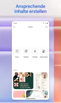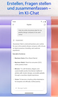 Ihre kreativen Visionen werden mit Microsoft 365 Copilot Wirklichkeit. Gestalten und bearbeiten Sie mühelos visuelle Inhalte wie Bilder, Poster, Banner, Videos oder Umfragen mit einer Vielzahl an benutzerfreundlichen Vorlagen. Digitalisieren Sie zudem im Handumdrehen physische Dokumente, Fotos und Notizen direkt über Ihre mobile Kamera. Für eine nahtlose Projektverwaltung bietet die App spezielle Notizbücher, in denen Sie Ideen, Dokumente und Links verknüpfen und Microsoft 365 Copilot bitten können, alles für Sie zusammenzufassen und Zusammenhänge herzustellen. Laden Sie Word-, Excel- und PDF-Dateien direkt von Ihrem Gerät hoch, um sie von der KI analysieren zu lassen, und speichern Sie die Ergebnisse ebenso unkompliziert wieder auf Ihrem Smartphone. Microsoft 365 Copilot vereint die Funktionalität von Word, Excel, PowerPoint und PDF-Bearbeitung in einer einzigen, leistungsstarken Anwendung und ist somit Ihr umfassendes Werkzeug für unterwegs.